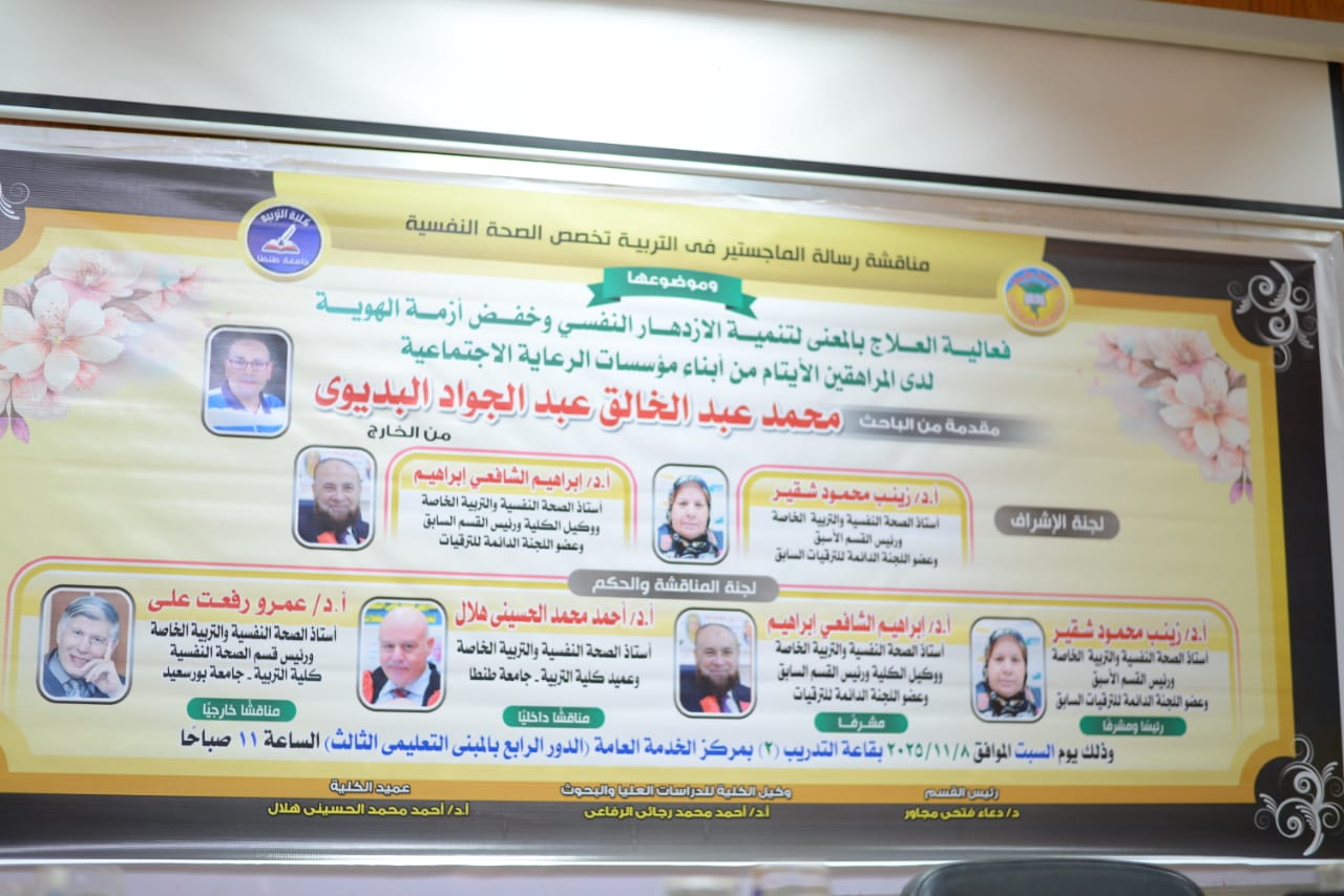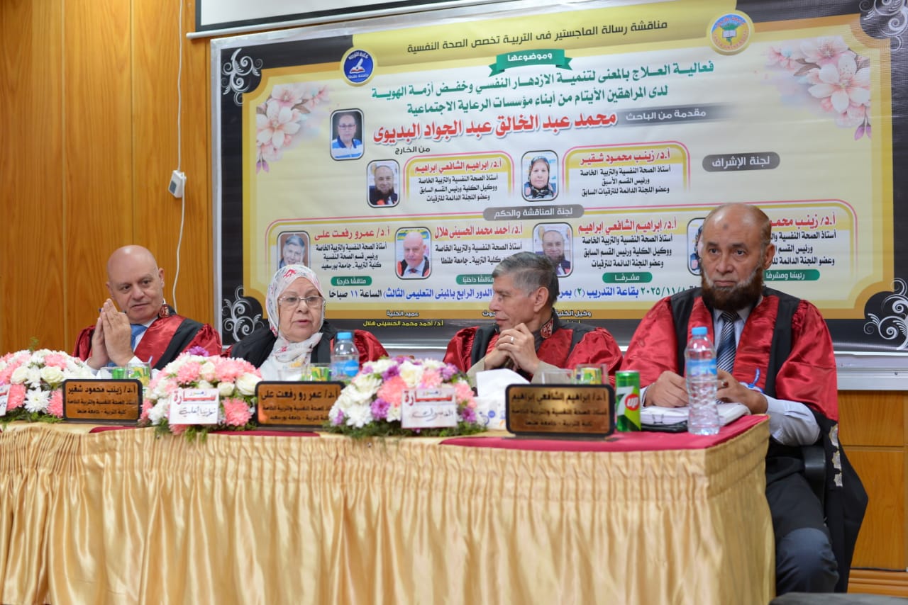 عقد قطاع الدراسات العليا بالكلية مناقشة رسالة الطالب محمد عبد الخالق عبد الجواد البديوي (من الخارج)، المسجل لدرجة الماجستير في التربية، تخصص الصحة النفسية، وذلك في موضوع: "فعالية العلاج بالمعنى لتنمية الازدهار النفسي وخفض أزمة الهوية لدى المراهقين الأيتام من أبناء مؤسسات الرعاية الاجتماعية".