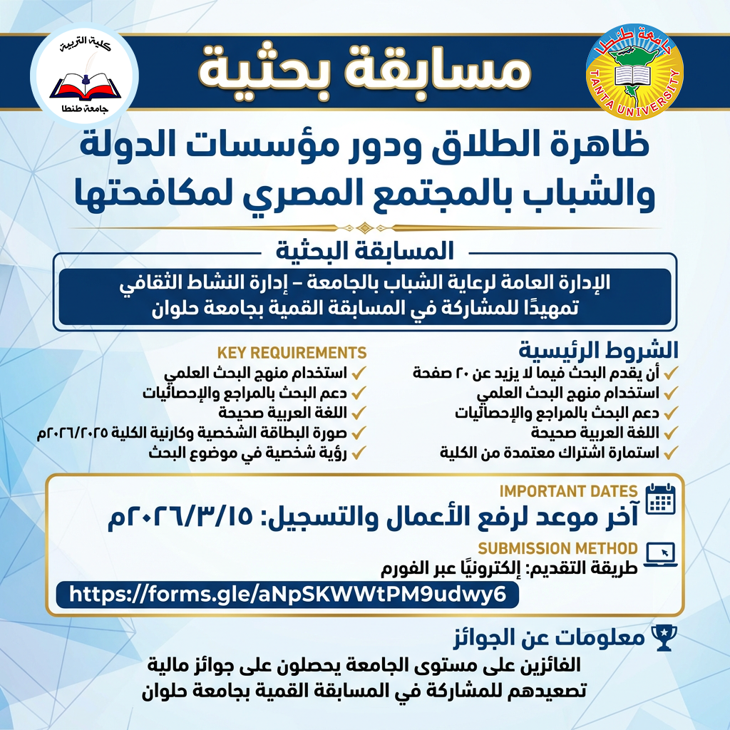 تعلن الإدارة العامة لرعاية الشباب بالجامعة – إدارة النشاط الثقافي – عن تنظيم مسابقة الموضوعات الاجتماعية (المسابقة البحثية)