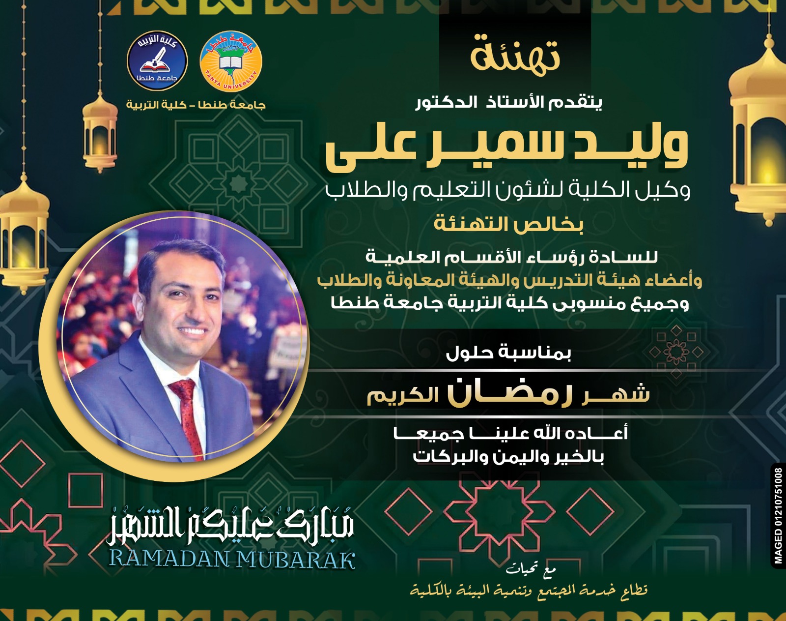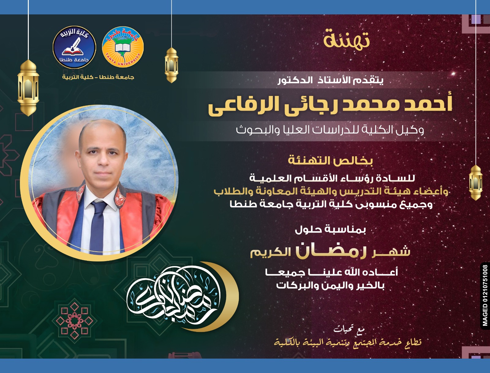 يتقدم الأستاذ الدكتور أحمد محمد رجائي الرفاعي، وكيل كلية التربية للدراسات العليا والبحوث بجامعة طنطا، بخالص التهنئة إلى السادة رؤساء الأقسام العلمية، وأعضاء هيئة التدريس، والهيئة المعاونة، والطلاب