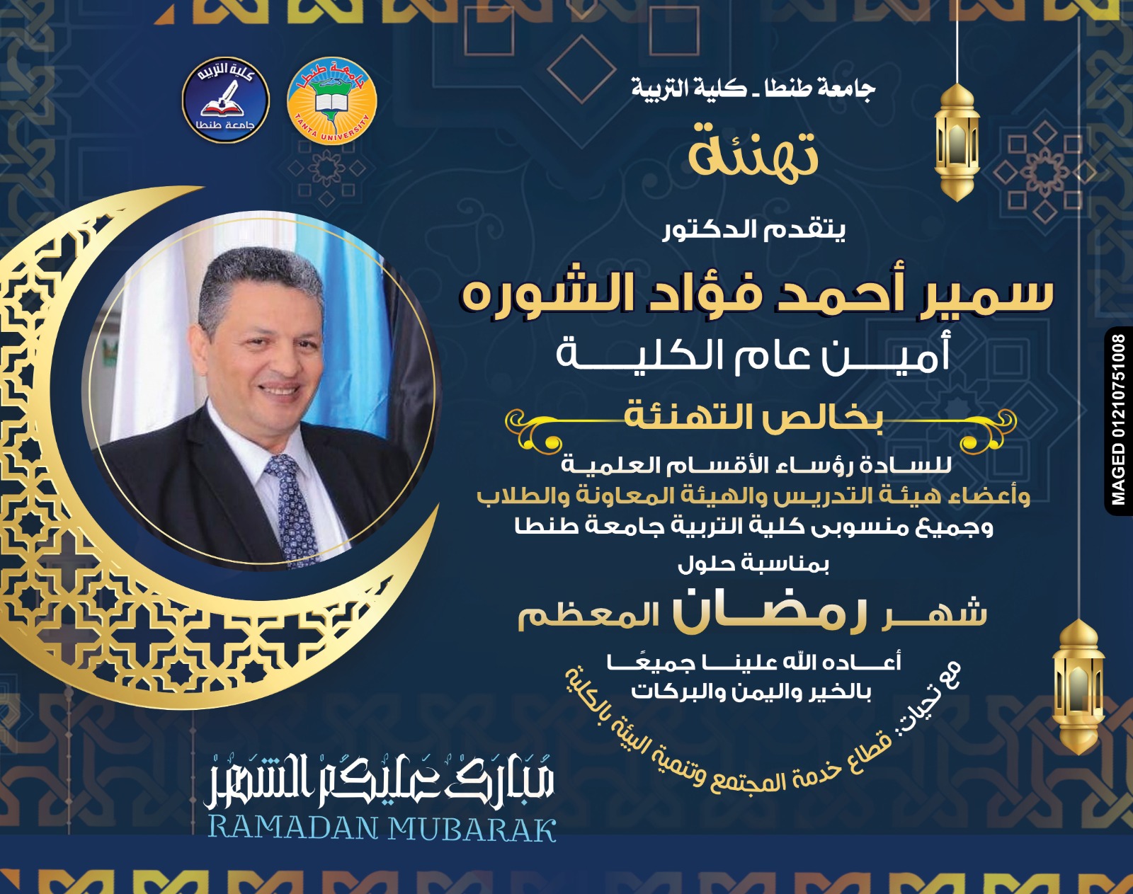 يتقدم الدكتور سمير أحمد فؤاد الشوره، أمين عام كلية التربية جامعة طنطا، بخالص التهنئة إلى السادة رؤساء الأقسام العلمية، وأعضاء هيئة التدريس، والهيئة المعاونة، والطلاب، وجميع منسوبي الكلية التربية جامعة طنطا، بمناسبة حلول شهر رمضان المعظم